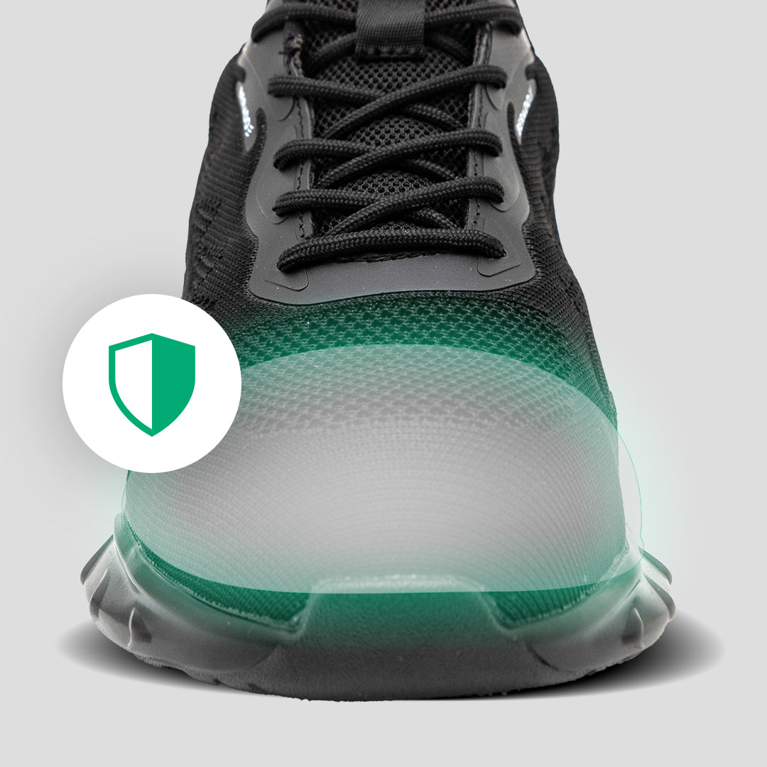 Geavanceerde glasvezel bescherming die 40% lichter is dan traditioneel staal. Brede teenruimte voor natuurlijke beweging.